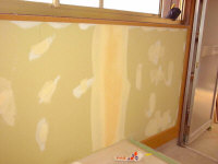 なるべく下地を平坦に近づけなめらかになるように壁紙を貼る前に起伏があるところにパテという粘土状のものを塗って下地を整えます。ただし万能ではないので若干起伏が残る場合もあります